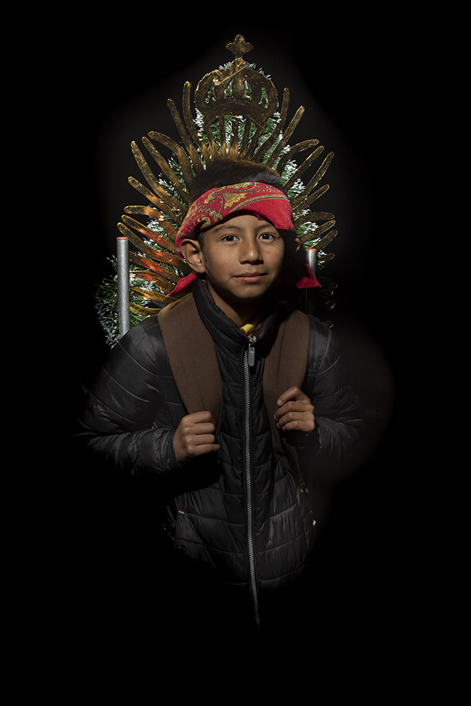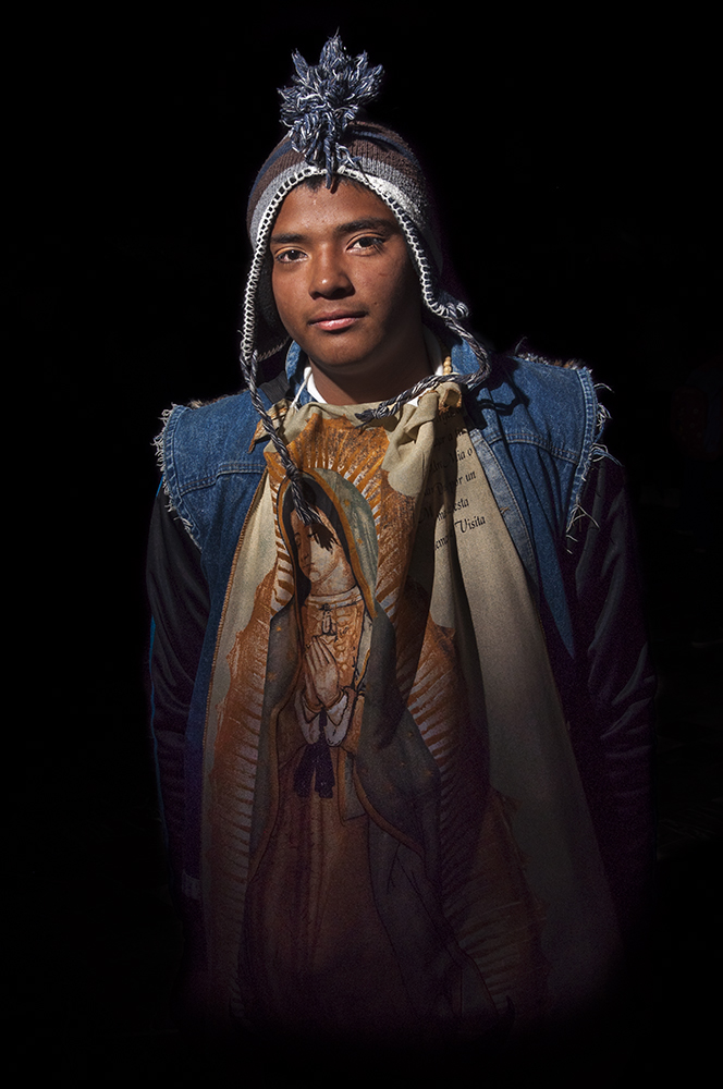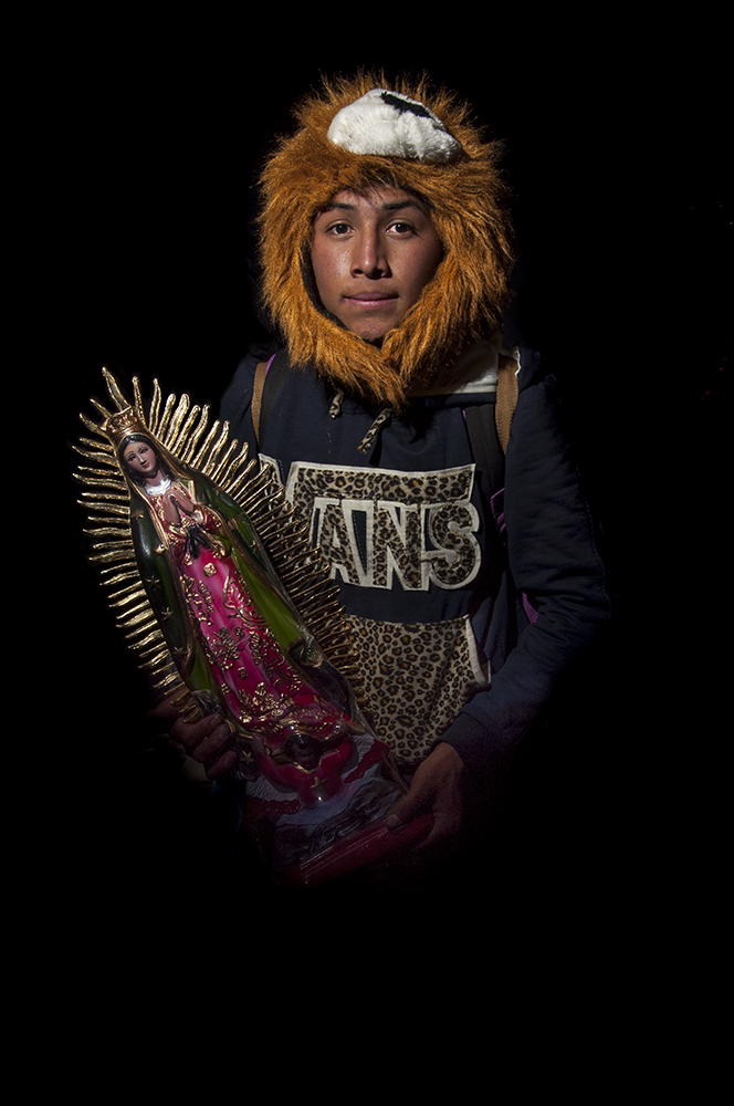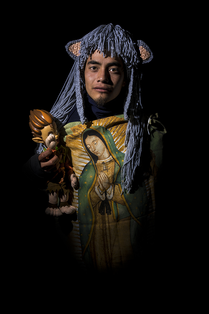En estos retratos busco ilustrar cómo los jóvenes mexicanos, al seguir la devoción inculcada por sus mayores a través de generaciones de herencia cultural, integran elementos contrapuestos al rito religioso de la procesión solemne por naturaleza, con vestimenta que refleja la influencia que reciben actualmente de diversas culturas.